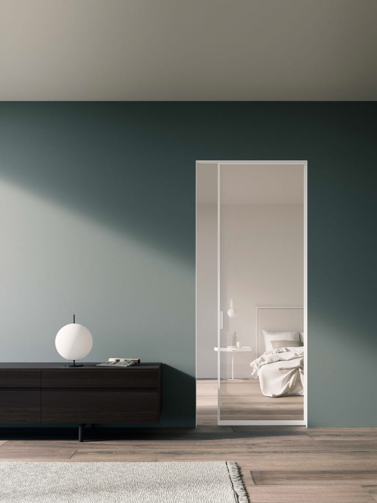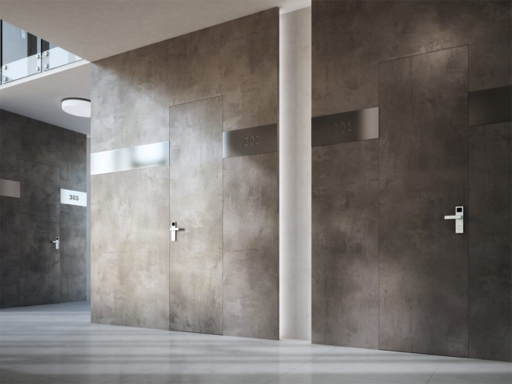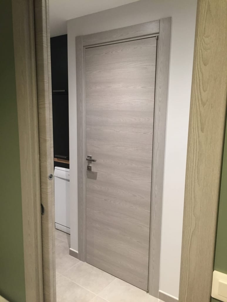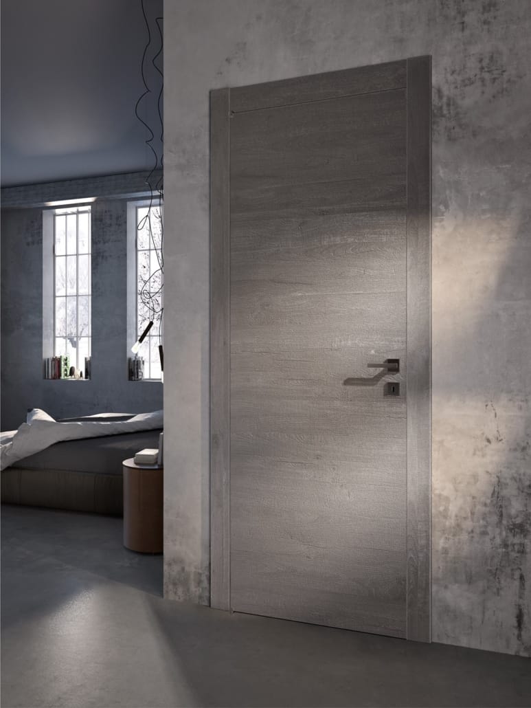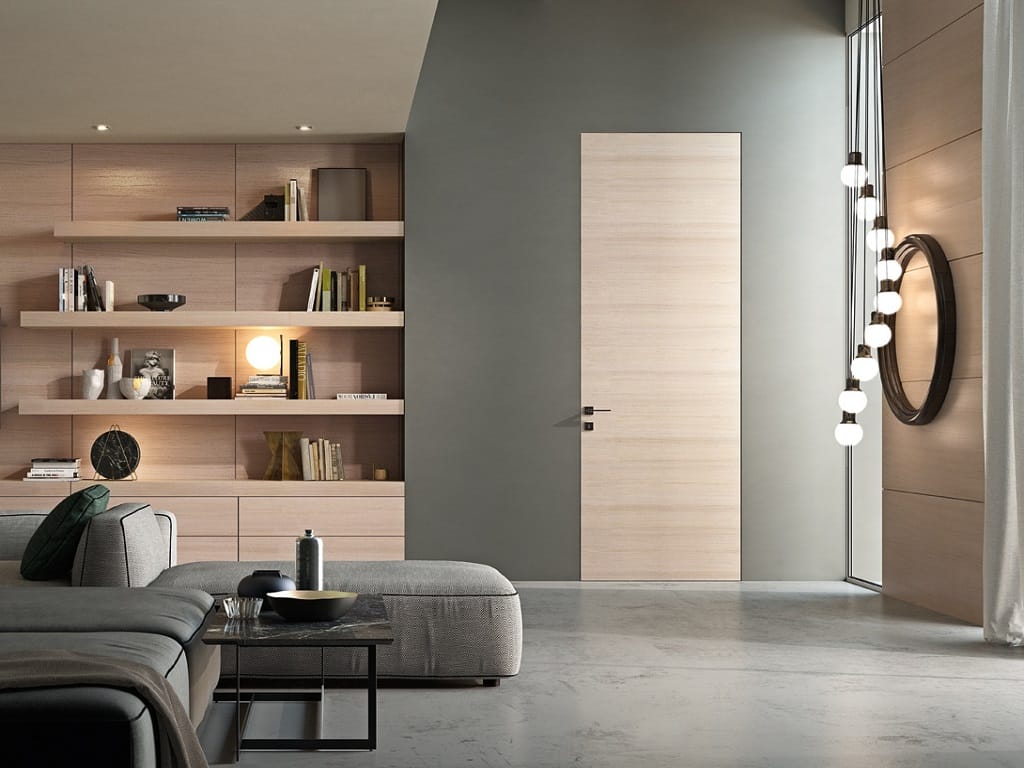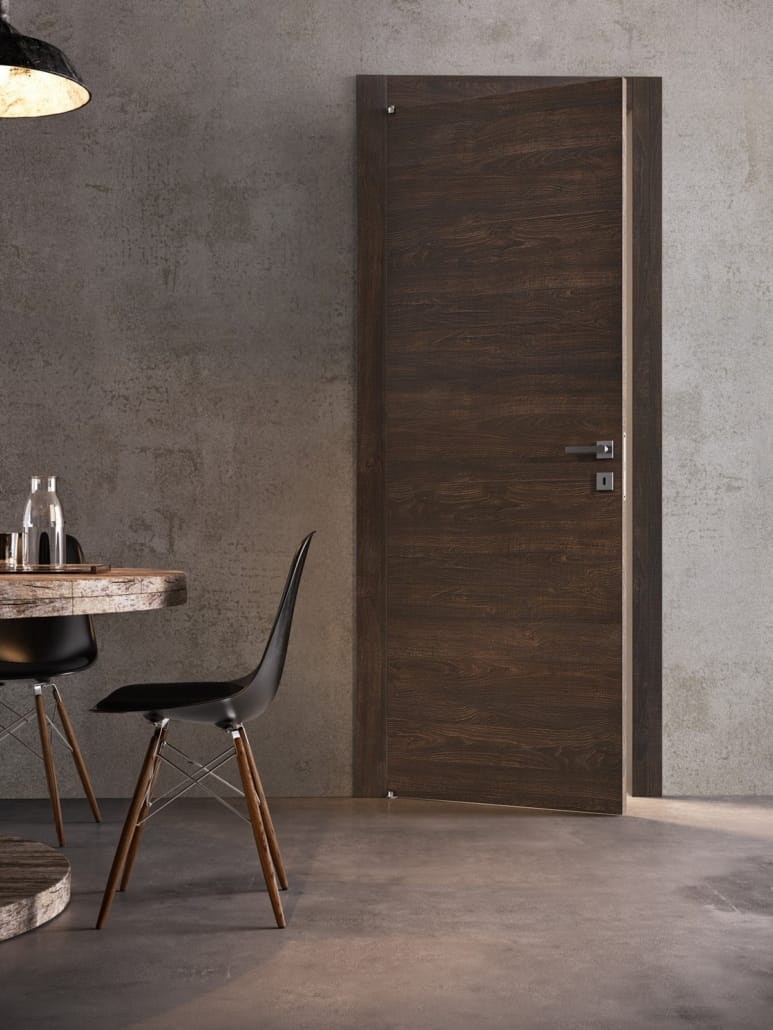 La porte à affleurement offre un résultat esthétique minimaliste et épuré de tous les habillages que l’on retrouve sur le bloc-porte de type fin de chantier.